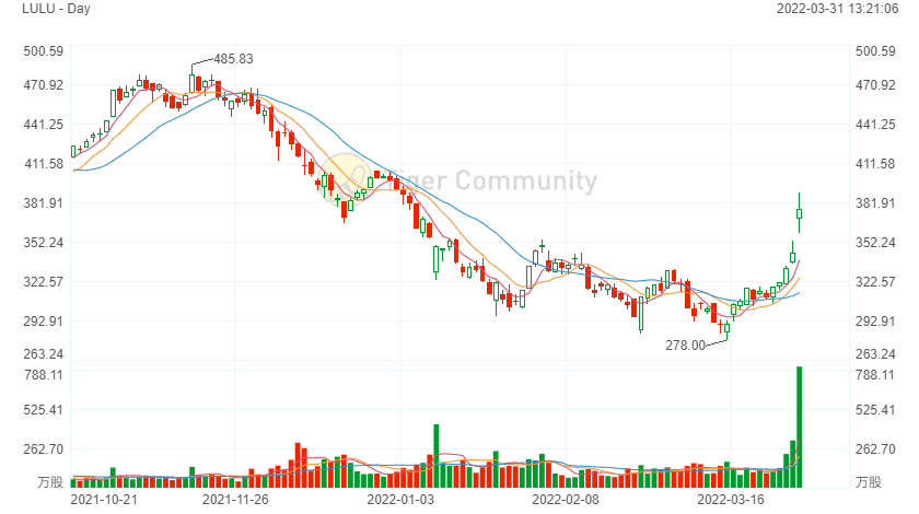 After trading up nearly 4% in Tuesday’s session in anticipation of the release, their shares jumped in the after-hours session and were up another 8% in Wednesday’s pre-market trading. Wall Street, while happy with the headline figures, seems to have been particularly impressed with management’s forward guidance. Lululemon reported that for the full year, they expect FY22 revenue of $7.49 billion to $7.615 billion versus $7.24 billion and EPS of $9.15 to $9.35 versus the $9.05 consensus.