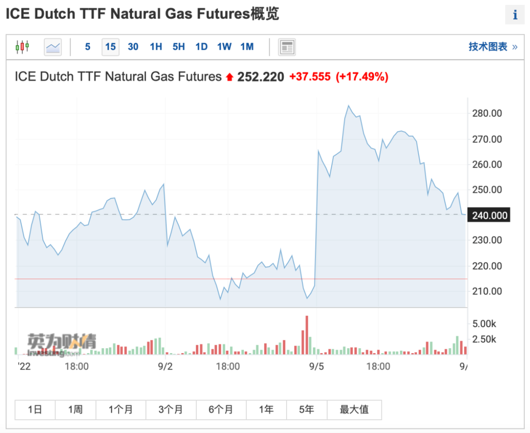 其中,欧洲能源市场的危机尤为严峻,“雷曼危机”的警报彻底拉响。当地时间9月5日,作为欧洲基准的荷兰近月天然气期货价格一度飙涨超32%,创近6个月来的最大单日涨幅,同时也推动欧洲的电力价格上涨。