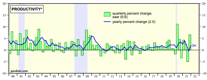 Thanks to labor shortages, companies have really increased their spending on technology and machines (capital spending) to boost productivity. Defined as output per worker, productivity goes up when the technology-to-labor ratio increases in the workplace.