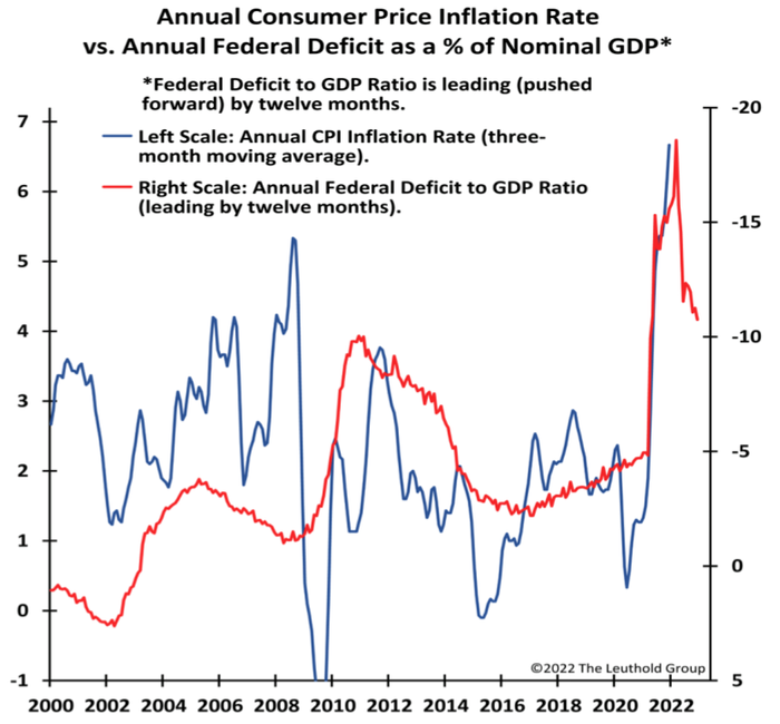 In the chart below, we see that the contraction in the federal deficit relative to GDP can foreshadow a decline in inflation. The chart comes from James Paulsen, an economist and chief market strategist at the independent research firm Leuthold. Note that the red line representing the deficit-to-GDP ratio is pushed forward by a year, because of the lag in the impact this has on inflation.