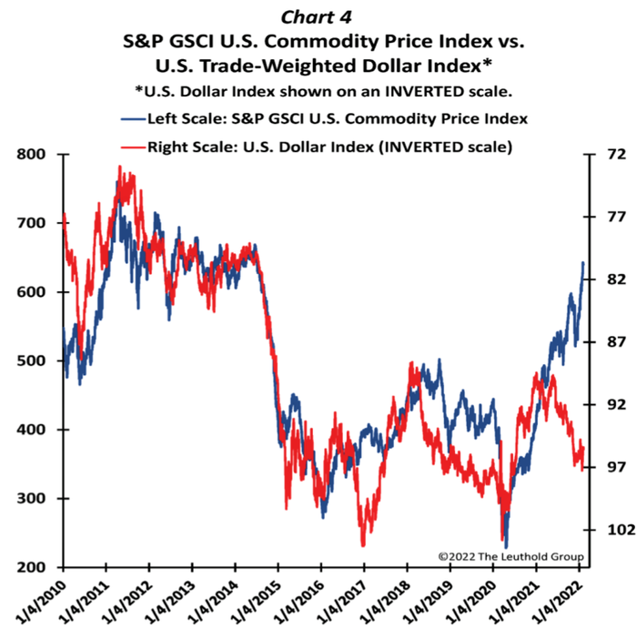 A strong dollar reduces foreign demand for U.S. products. This cools off inflation in the U.S. That is happening now. This chart shows the tight relationship between the dollar and U.S. prices. The red line representing the dollar is on an inverted scale, which means it declines as the dollar strengthens. The blue line is prices.
