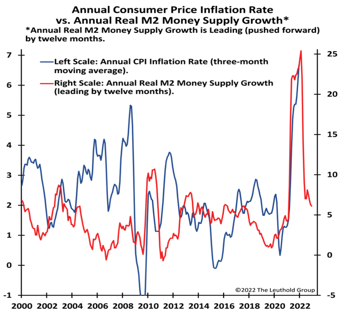 This is a pretty good predictor of inflation, says Paulsen. This makes sense, because when people get more money (more is injected into the economy), they tend to spend more, driving up prices. Currently, money supply growth is contracting, so inflation will too.