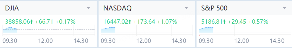 At 10:30 a.m. ET, the Dow Jones Industrial Average (.DJI) was up 66.71 points, or 0.17%; the S&P 500 was up 29.45 points, or 0.57%; and the Nasdaq Composite was up 173.64 points, or 1.07%.