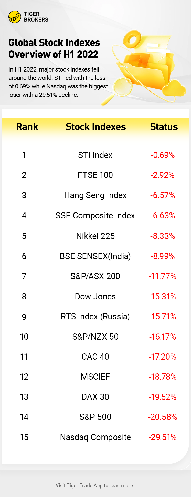 In 2022 H1, due to Fed's rate hikes and the conflicts between Russia and Ukraine, major stock indexes fell around the world. STI led with the loss of 0.69% while Nasdaq was the biggest loser with a 29.51% decline.
