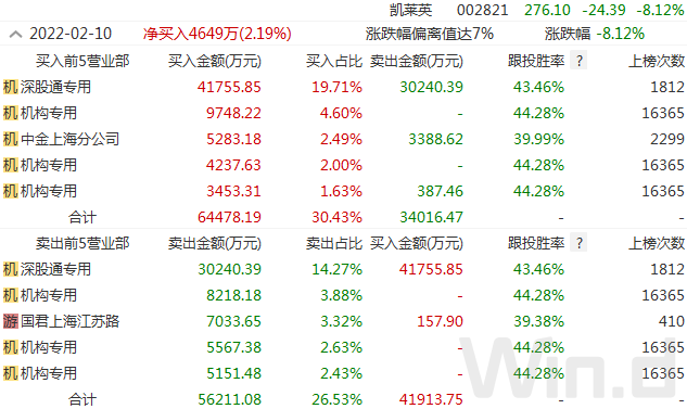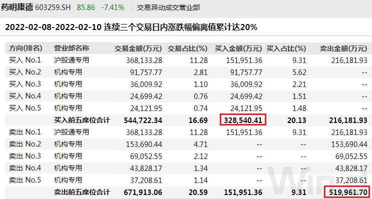 除药明康德外,凯莱英同样遭到机构抛售,盘后龙虎榜数据显示,深股通买入4.18亿元并卖出3.02亿元,三机构席位合计净买入1.71亿元,三机构席位合计卖出1.89亿元。