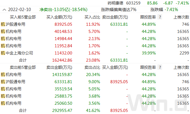 虽然公司表示,相关事件对具体业务影响不大,但依旧难以阻止机构对关联公司抛售的行为。从2月10日龙虎榜公布的数据来看,沪股通买入8.39亿元并卖出6.33亿元,3机构席位合计买入6.71亿元,4机构席位合计卖出22.96亿元。