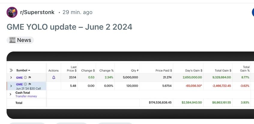 The Reddit trading crowd’s favorite trader holds 5 million shares of GameStop worth $115.7 million as of Friday’s closing price, according to the account snapshot posted on Reddit’s r/SuperStonk forum. The account also showed a position of 120,000 call options in GameStop with a strike price of $20 that expire on June 21st that were purchased for about $5.68 each. GameStop shares closed Friday at $23.14.
