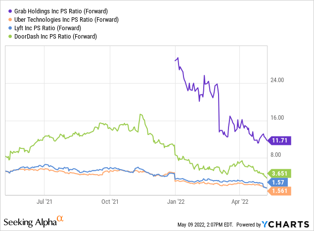 Despite the massive drop in share price and market cap, the company's valuation is still expensive. At the current price of $2.84, it has a PS (price to sales) ratio of 11.7. From the chart below, you can see that it is significantly more expensive than other ride-sharing and food delivery companies like Uber, DoorDash (DASH), and Lyft (LYFT). It is trading at almost an 8x premium compared to Uber and Lyft.