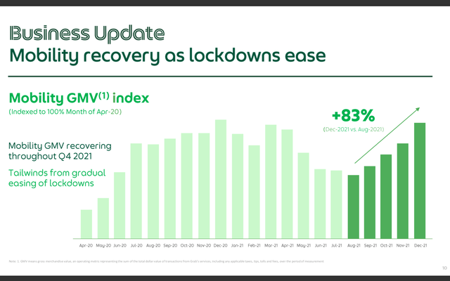 Part of the reason the company missed its forecasted financials is due to the lockdown in SEA in 2021. With ride-sharing being its biggest revenue stream, the lockdown significantly impacted its financials. It also reduces the usage of the e-wallet, as customers aren't able to shop and spend outside. This situation unprecedentedly affected the progression of its Super App. From the chart below, you can see that the company's mobility GMV (gross merchandising volume) dipped from December 2020 to August 2021 but has been recovering strongly since. Monthly transacting users also reached an all-time high of 27.7 million after bottoming last year. I believe this uptrend will continue as COVID cases ease.