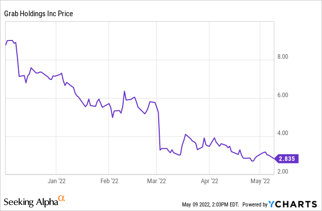 Grab Holdings Limited (NASDAQ:GRAB) went public through a SPAC merger with Altimeter Growth Corp. The company was valued at $39.5 billion in equity value and $30.4 billion in EV (enterprise value, making it the largest SPAC dealto date. The stock price went up from $10 to $17 right after the merger, but has been plummeting since. It is now down over 80% from its high last year trading at $2.76 currently.