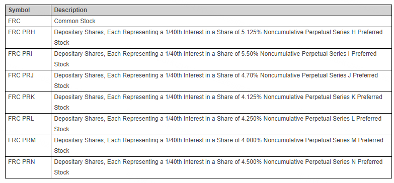 The New York Stock Exchange LLC (“NYSE” or “Exchange”) announced today that the staff of NYSE Regulation has determined to commence proceedings to delist the eight securities enumerated below (“Securities”) of First Republic Bank (the “Company”) from the NYSE. Trading in the Company’s Securities will be suspended immediately.