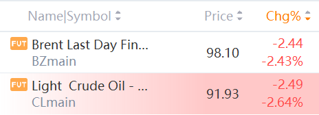 Brent crude futures were down $2.44, or 2.43%, at $98.1 a barrel. West Texas Intermediate (WTI) crude futures slipped by $2.49, or 2.64%, to $91.93. Both contracts had seesawed previously.