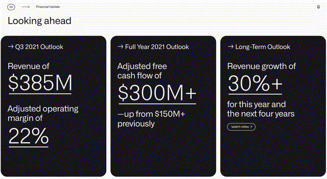 In Q2 of 2021, PLTR reinforced their long-term outlook of 30%+ revenue growth for 2021 and the next 4 years, bringing them through 2025. PLTR had projected that its 2021 Adjusted FCF (free cash flow) would exceed $300 million in 2021, which would be a 100% increase from its previous outlook. I dislike adjusted numbers and would rather look at straight FCF, which is cash from operations minus CapEx or purchases of property and equipment. In 2021, PLTR ended the year generating $1.54 billion in revenue and $321.22 million of FCF for an FCF margin of 20.83%.