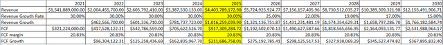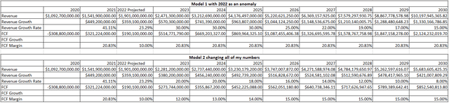 I built 2 models to see where PLTR's numbers could go. My original cash flow projection called for $2.53 billion of FCF from $12.16 billion of revenue in 2030 based on 2021's FCF margin, and my revenue assumptions extrapolated past the 2025 projection from PLTR. In model 1, I chalked 2022 up to an anomaly. If I keep the revenue growth rate the same from 2023-2030 and the FCF margin the same as my previous figures, PLTR will generate $10.2 billion of revenue and $2.12 billion of FCF in 2030.