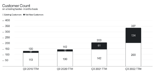 PLTR didn't go public until the fall of 2020, and after they did, their new customer base exploded as more information about PLTR was circulated, and companies saw successful use cases from their industry peers. In 2021 PLTR added 49 additional new customers on a TTM basis in Q3, up 408.33% YoY, as they finished with 61 new customers. In Q3 of 2022, PLTR experienced a huge increase in new customers. PLTR's new customer base in Q3 of 2022 on a TTM basis grew by 119.67% or 73 new customers YoY to 134.