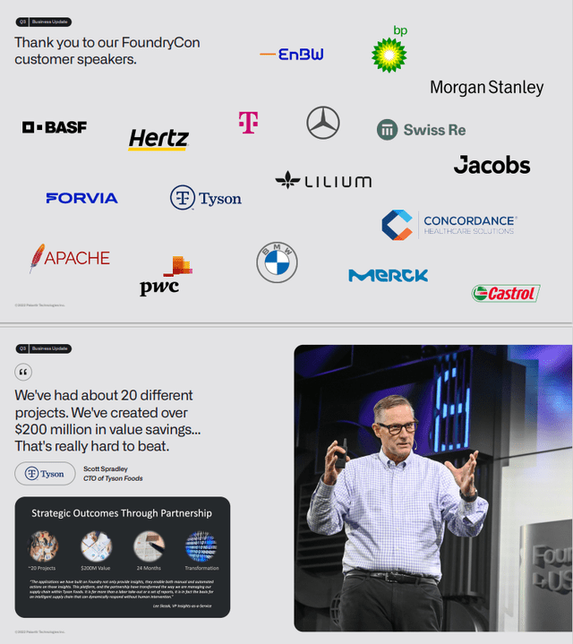 Tyson Foods CTO Scott Spradley discussed the strategic outcomes that were achieved through transforming their business and generating $200 million in savings across 20 projects. John Rickerman from Jacobs highlighted that they are on track to save $300,000 annually at one of their sites, which was a 20% savings, and they have 300 sites where the same process can be replicated at. Colonel Jennifer Krolikowski stated that 15,000 people would not have been able to be evacuated from Afghanistan without utilizing PLTR's software.