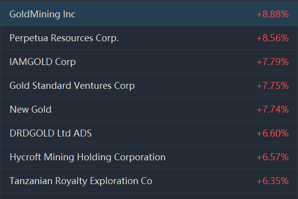 Barrick Gold, GoldMining, Newmont, Royal and Kinross rose between 1% and 9%.
