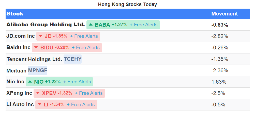 EV shares traded mixed with shares of Xpeng trading 2.5% lower while Nio stock jumped 1.63%. Shares of Alibaba fell over 0.8% in morning trade while Meituan, JD.com lost over 2%.