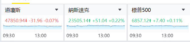 12月5日,华尔街主要三大指数在历史新高面前原地徘徊,一批小盘题材股掀起上涨潮,将小盘股指数率先拱上新高。截至收盘,标普500指数涨0.11%,报6857.12点;纳斯达克综合指数涨0.22%,报23505.14点;道琼斯工业平均指数跌0.07%,报47850.94点。作为最能代表美股市场小盘股的指标,罗素2000指数收涨0.76%,突破10月27日创出的前高。
