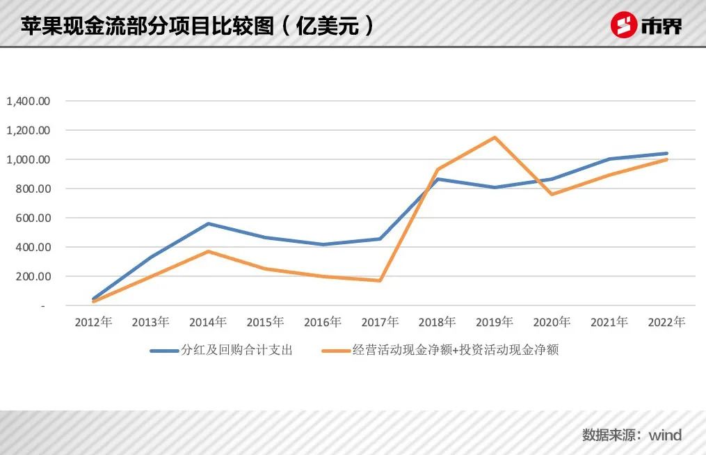 但比较苹果分红和回购支出与每年经营活动和投资活动净额之和,会发现大多数年份苹果用于分红和回购的支出,都大于经营活动和投资活动产生的现金净额。这就意味着苹果赚的钱常常不够花。