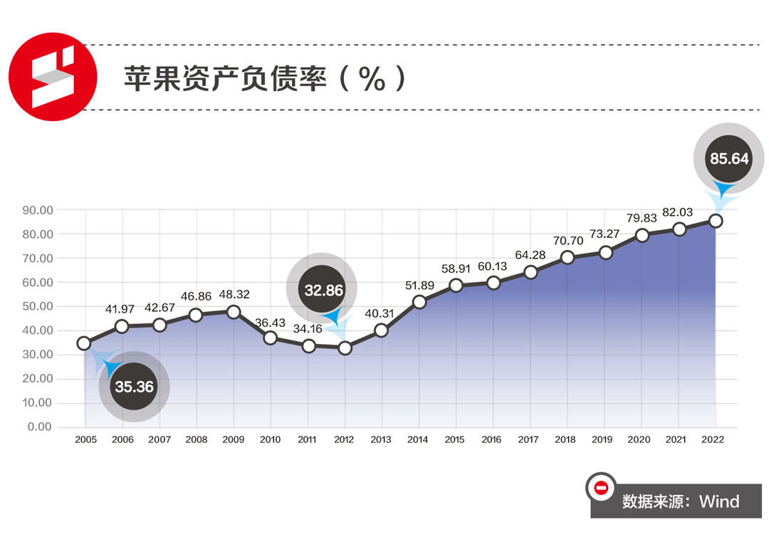 截至2022年9月末,苹果资产负债率达到85.64%,是其历史上最高水平。