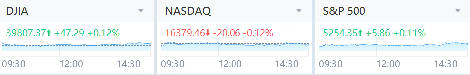 The Dow Jones Industrial Average rose 47.29 points, or 0.12%, to 39,807.37, the S&P 500 rose 5.86 points, or 0.11%, to 5,254.35 and the Nasdaq Composite fell 20.06 points, or 0.12%, to 16,379.46.