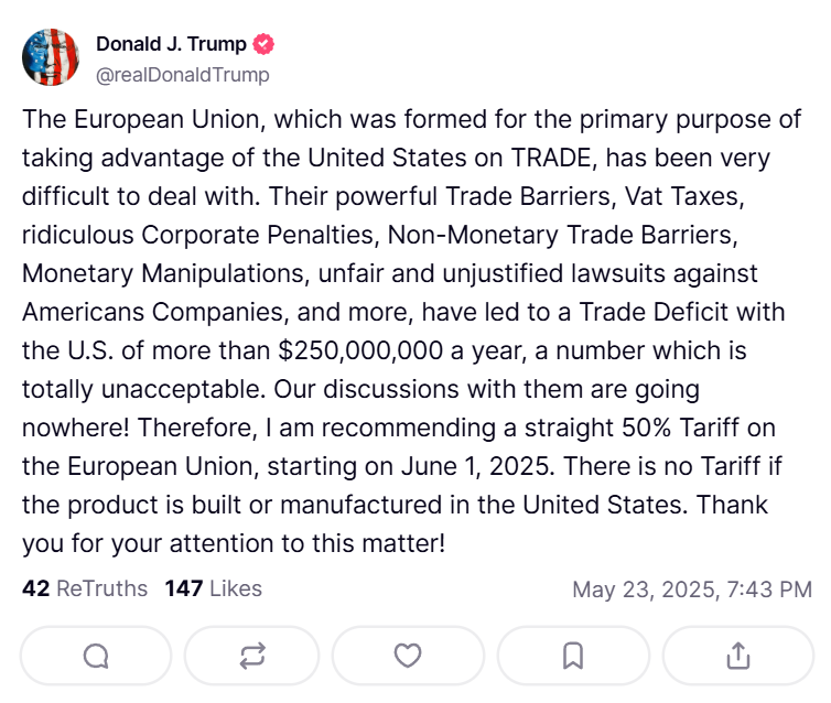 Trump Recommends 50% Tariff on the European Union, Starting June 1