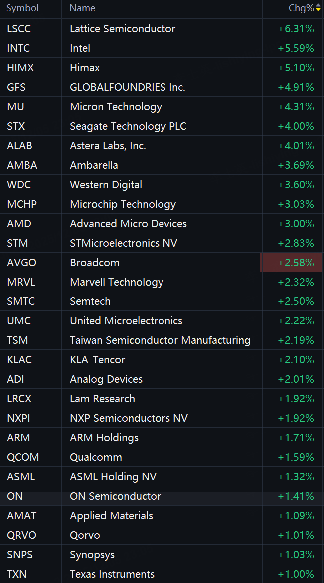 Some chip stocks jumped in morning trading. Intel rose 6%; GlobalFoundries rose 5%; Micron, Seagate, and Western Digital rose 4%; Microchip Technology, AMD, STMicroelectronics, and Broadcom rose 3%; Marvell Technology, TSMC, Arm, and Qualcomm rose 2%; ASML rose 1%.