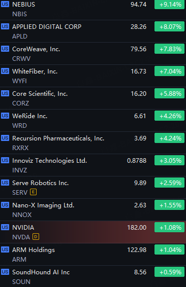 Nvidia Concept Stocks Rally. Nebius Up 9%; Applied Digital And CoreWeave Up 8%; WhiteFiber Up 7%; Core Scientific Up 6%; WeRide and Recursion Up 4%.