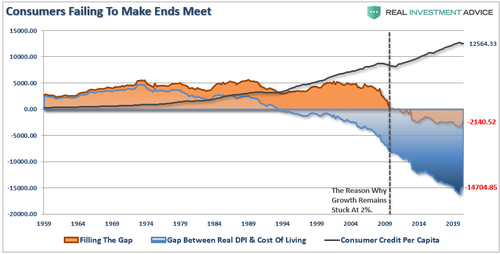 I often show the “gap” between the “standard of living” and real disposable incomes. In 1990, incomes alone were no longer able to meet the standard of living. Therefore, consumers turned to debt to fill the “gap.”