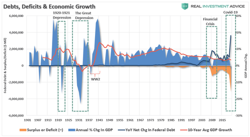 “The chart below shows the deficit, 10-year average GDP growth, and the annual change in Federal Debt. The problem should be obvious. Since the Federal government began ramping up debt, and running deficits, growth continues to deteriorate. Such is not a coincidence.”