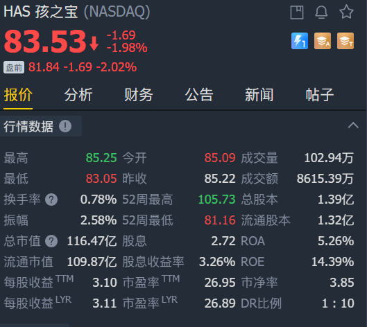 4月19日,孩之宝盘前发布财报,财报显示:一季度净营收11.6亿美元,市场预估11.5亿美元;一季度经调整后每股收益57美分,市场预估64美分。