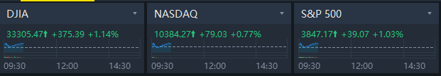 U.S. stocks showed a U-turn in morning trading; Dow Jones and S&P 500 soared over 1% while Nasdaq gained nearly 0.8%.