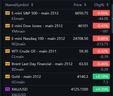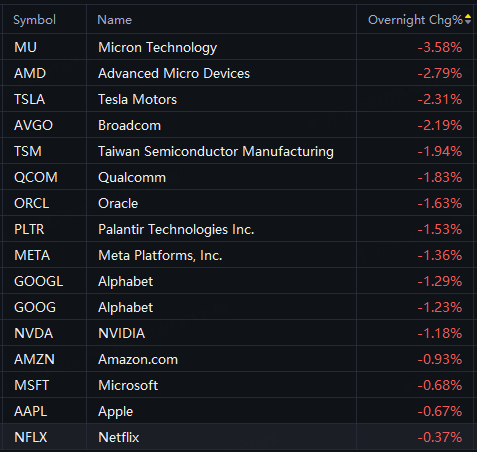 Big tech stocks fell in overnight trading. Micron fell 4%; AMD fell 3%; Broadcom, Tesla, TSMC, Oracle fell 2%; Nvidia, Alphabet, Apple fell 1%.
