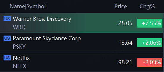 Shares of WBD rose over 7% on the news while Paramount Skydance gained 2%; Netflix fell 2%.