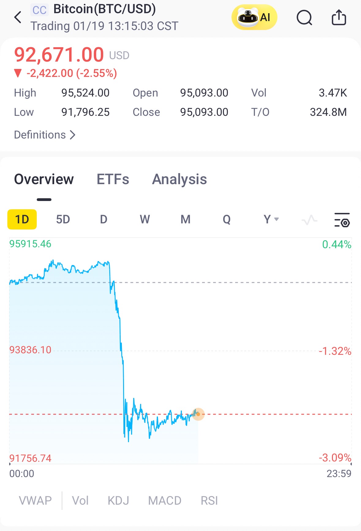 Bitcoin is in the red as Asia begins its trading week, falling about 3% to trade near $92,500 as a derivatives-driven rally lost momentum.