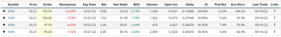 Instead of the October 105 call, let’s look at the October 95 call (last row). Selling the 95 call option for $3.45 generates an income of 3.84% in 32 days, equalling around 42.51% annualized. If XOM closes above 95 on the expiration date, the shares will be called away at 95, leaving the trader with a total profit of $524 (gain on the shares plus the $345 option premium received).