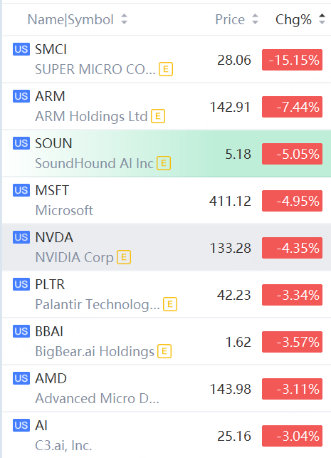 AI stocks fall on Thursday. Super Micro tumbles 15%; Arm Holdings sinks 7%; Microsoft falls 5%; Nvidia drops over 4%.