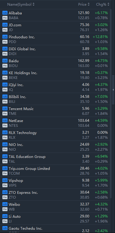Good news!  Hot Chinese ADRs have jumped in Premarket Trading.  Nice change from the recent downturns. 🚀🚀🚀🌙🌙🌙