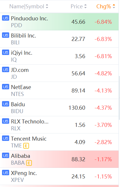 Alibaba, Baidu, Bilibili, iQiyi, JD.com, NetEase, Pinduoduo, and RLX Technology slid between 1% and 7%.