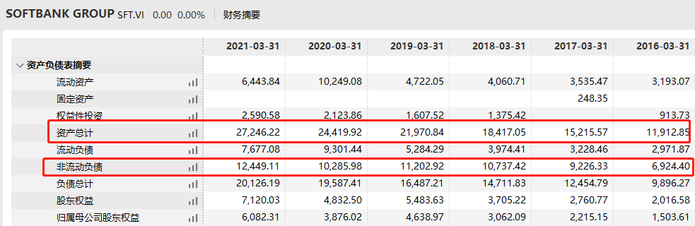 软银的财务报表显示,它的资产和负债规模都很庞大,说明借的钱很多,同时投资的公司也很多;每年的收益起伏不定,则主要是因为旗下上市公司的股价波动,像去年全球大放水,股市畅旺,软银自然就收获了历史上最大的利润年。