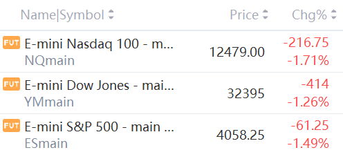 Futures early Monday (4:40 a.m. ET): Dow -1.26%; S&P 500 -1.48%; Nasdaq -1.71%.