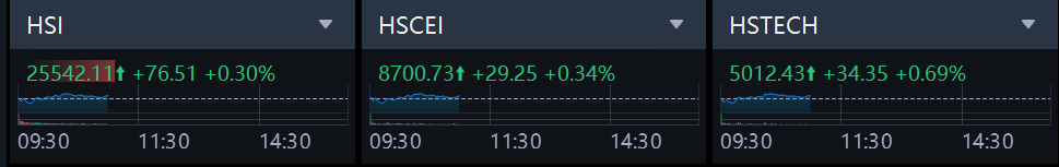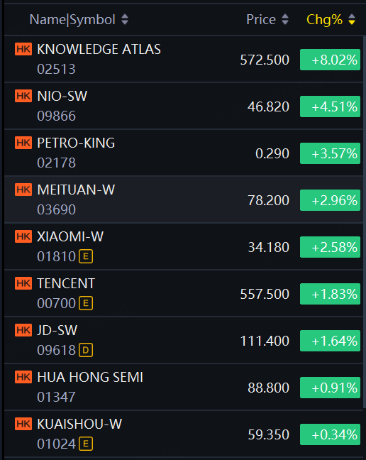 Knowledge Atlas up 8%; NIO up over 4%; Meituan, Xiaomi up nearly 3%; Tencent up about 2%; JD up over 1%.