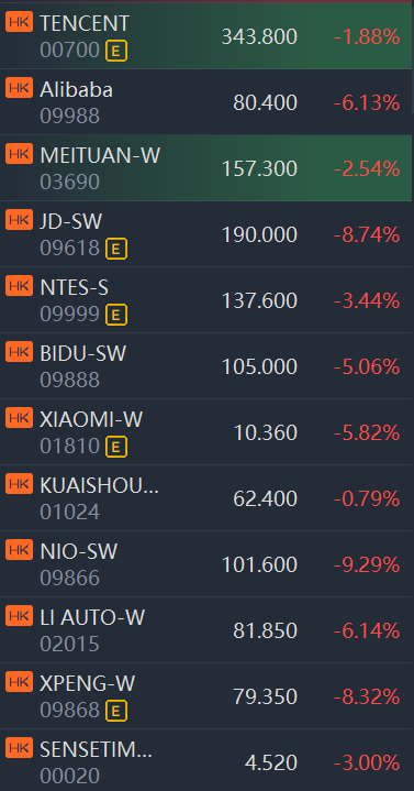 Hong Kong stocks slid on Thursday, with the Hang Seng technology index down nearly 4%. Tencent, Alibaba, JD.com, NetEase, Baidu, Xiaomi, Kuaishou, Bilibili, Nio, Xpeng and Li Auto fell between 1% and 9%.