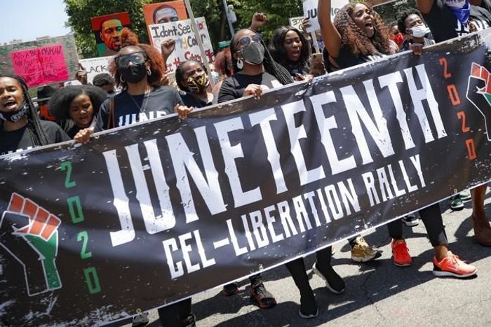 People gather at a Juneteenth rally in 2020 in Brooklyn, N.Y.