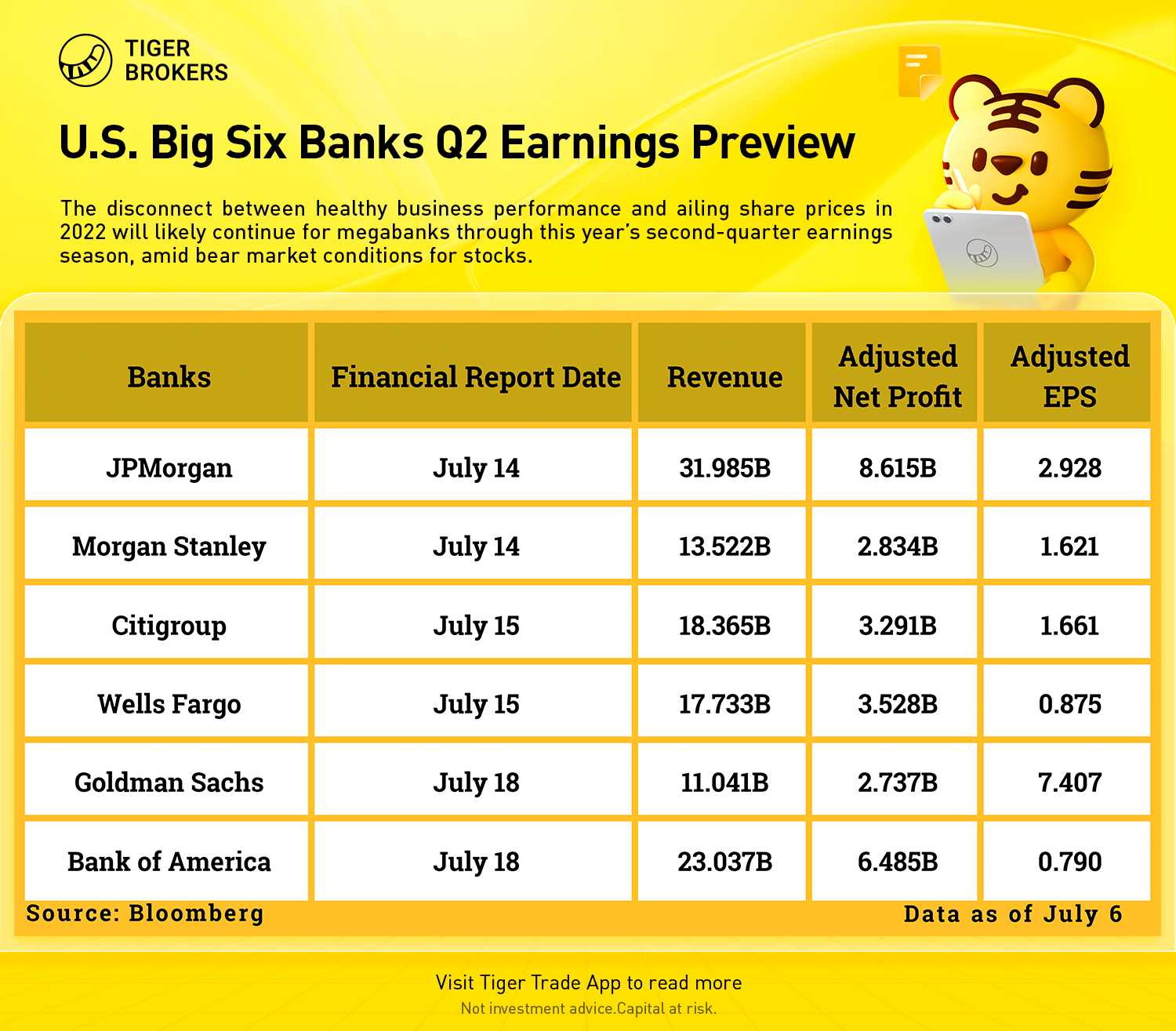 The disconnect between healthy business performance and ailing share prices in 2022 will likely continue for megabanks through this year’s second-quarter earnings season, amid bear market conditions for stocks.