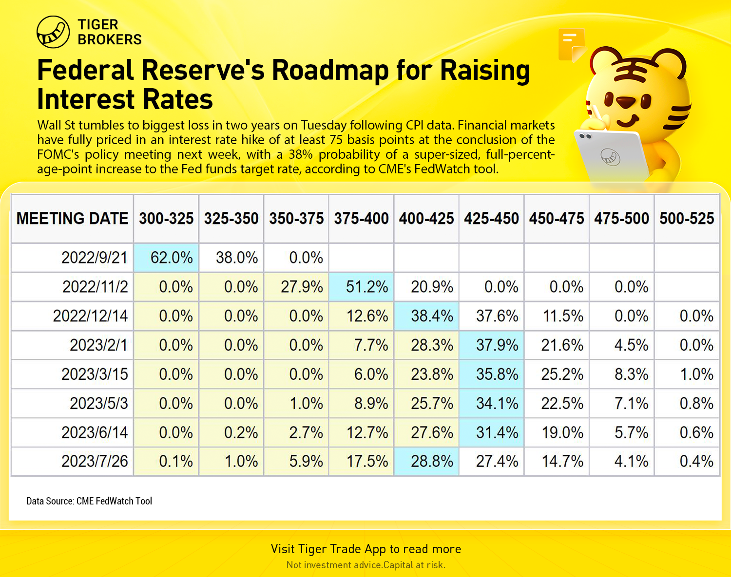 Financial markets have fully priced in an interest rate hike of at least 75 basis points at the conclusion of the FOMC's policy meeting next week, with a 38% probability of a super-sized, full-percentage-point increase to the Fed funds target rate, according to CME's FedWatch tool.