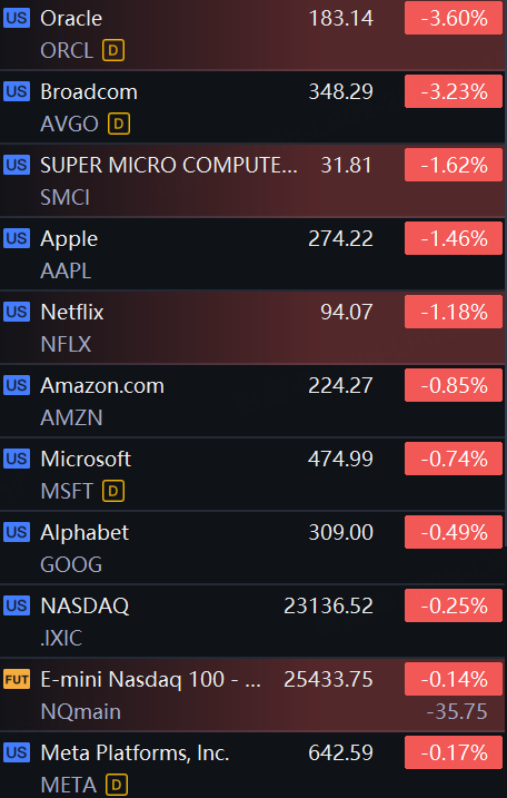 Wall Street's main indexes all turned negative. Oracle and Broadcom down 3%; SMCI, Apple, Netflix, Amazon down 1%.