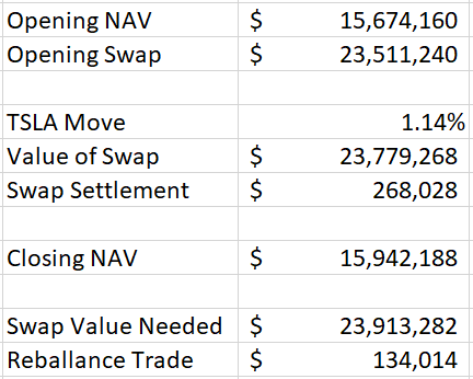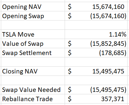 Here as I’m typing this, TSLA is up 1.14%. That makes the value of the fund’s swap -$15,852,845. The liability that the swap represents got bigger because TSLA got bigger. If the swap had to settle right this moment, the easiest way to think about this is that cash will now need to go from TSLQ to the swap counterparty just to settle up. So $178,685 leaves, making the new AUM of the fund $15,495,475. Now the fund needs -$15,495,475 in swap exposure going into tomorrow, but it’s still got $15,852,845 sitting in the swap account! So what does it do? It tells the counterpart to lighten up the swap by $357,371. That’s the trade done by the swap counterparty to even out their book at the end of the day.