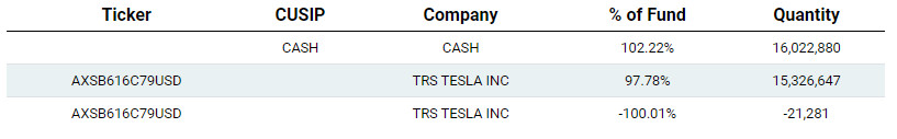 Put another way, creating new shares of TSLQ is much more like how new shares of a mutual fund are created — cash goes into the portfolio manager, which they then need to “put to work.” TSLQ is also super simple there because all it will ever hold is a giant slug of cash and a swap or two.